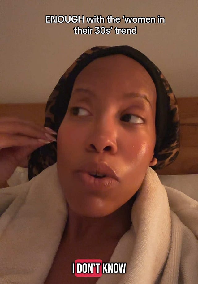 It all started last Saturday night. After working on my skincare routine and rotting in bed for a few hours, I noticed that my TikTok TL kept feeding me this disturbing trend: ”Women in their 30s” videos. I wasn’t sure of its impetus, but it seemed to have convinced conventionally attractive young people to show how good they looked…at 30. Yeah, internet, their well-stylized selfies seemed to declare, I still got it! I sat up in bed, immediately annoyed. What was the meaning of this inane trend, exacerbating ageist beauty standards? The idea of glowing at 30 was neither a miracle nor a flex. Who had lied to these children?! I immediately began railing against the content.